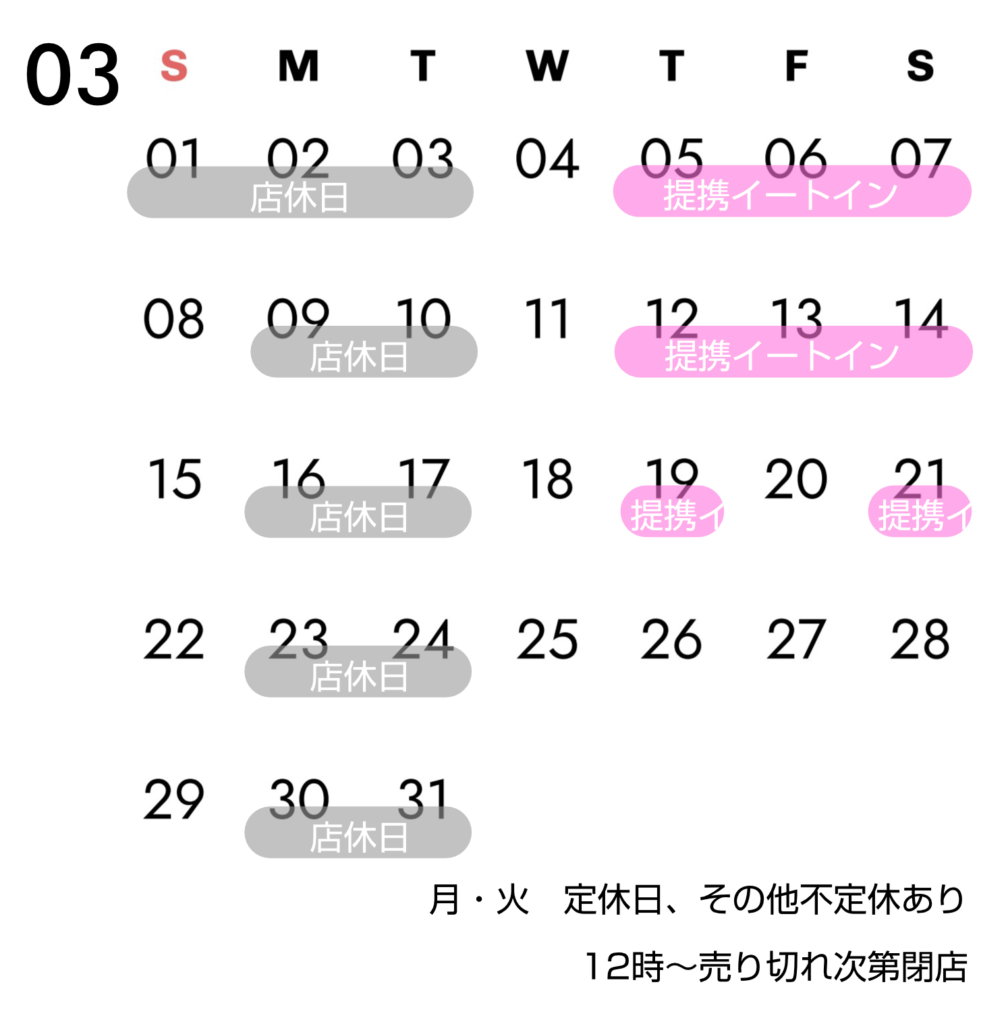 営業時間:12:00~売切れ次第閉店。